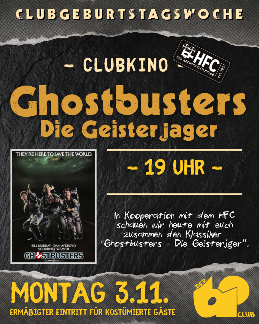 Zusammen mit dem HFC zeigen wir den Film „Ghostbusters – Die Geisterjäger”. Wie bei jeder Öffnung gibt es natürlich auch Snacks und Getränke. Kommt also vorbei und schaut euch den Film an! diesen fantastischen Klassiker mit uns!